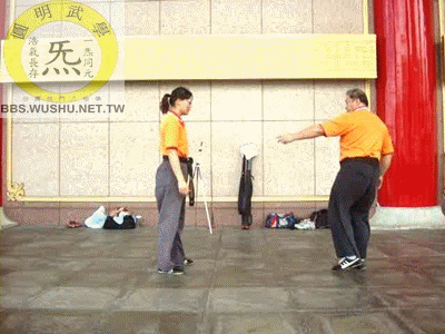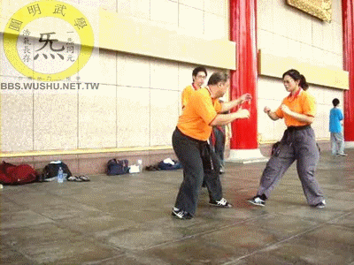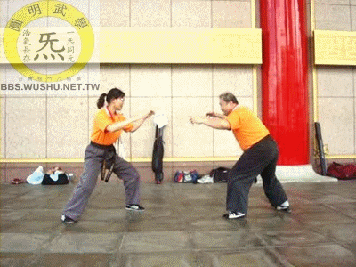 透過「鷹翔」的身法使用,在轉換重心同時雙手如老鷹雙翼滑翔、盤旋攻擊對手,是一個用身法攻擊的對手連消代打的好方法。圖為老師示範鷹翔組手。